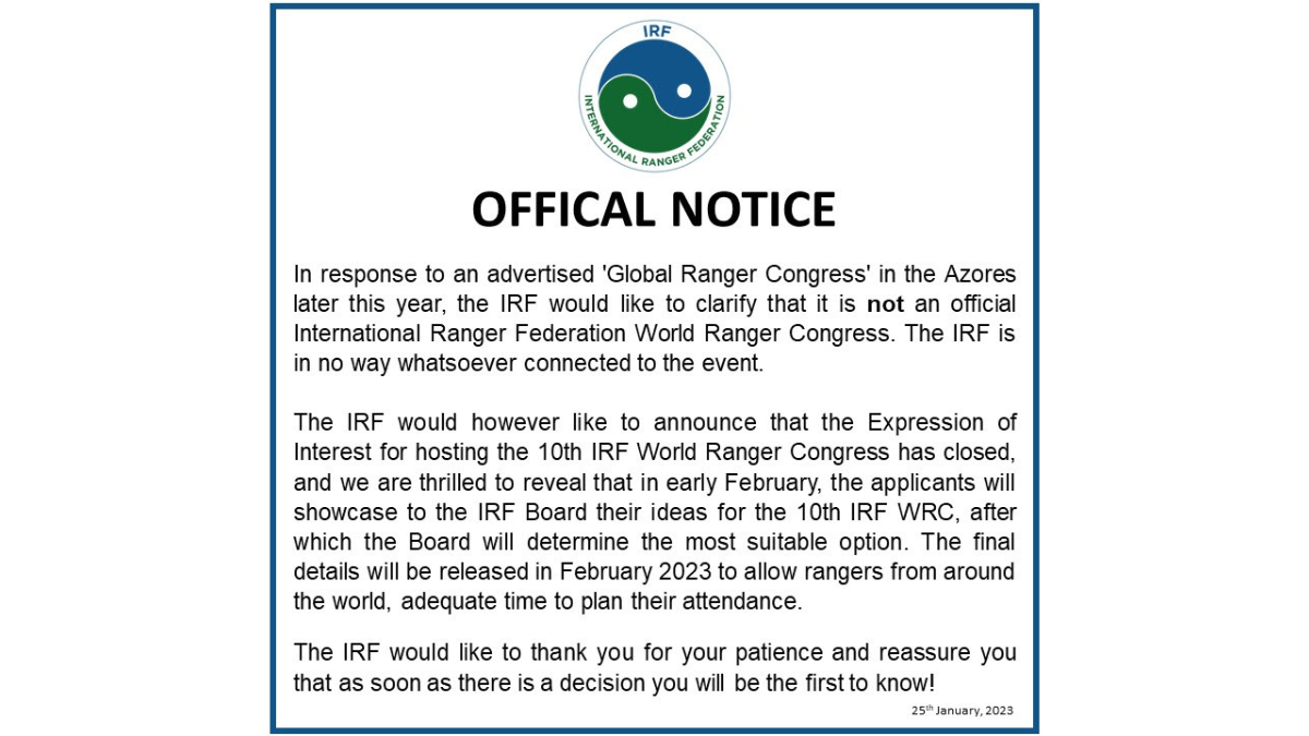 please see the note from IRF-president Chris Galliers concerning the now announced “Global Ranger Congress” on the Azores Island.