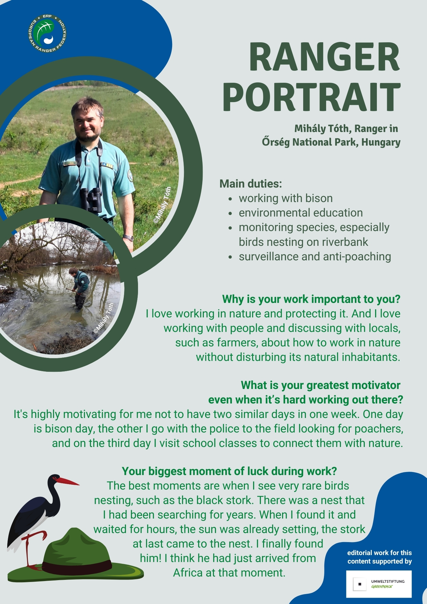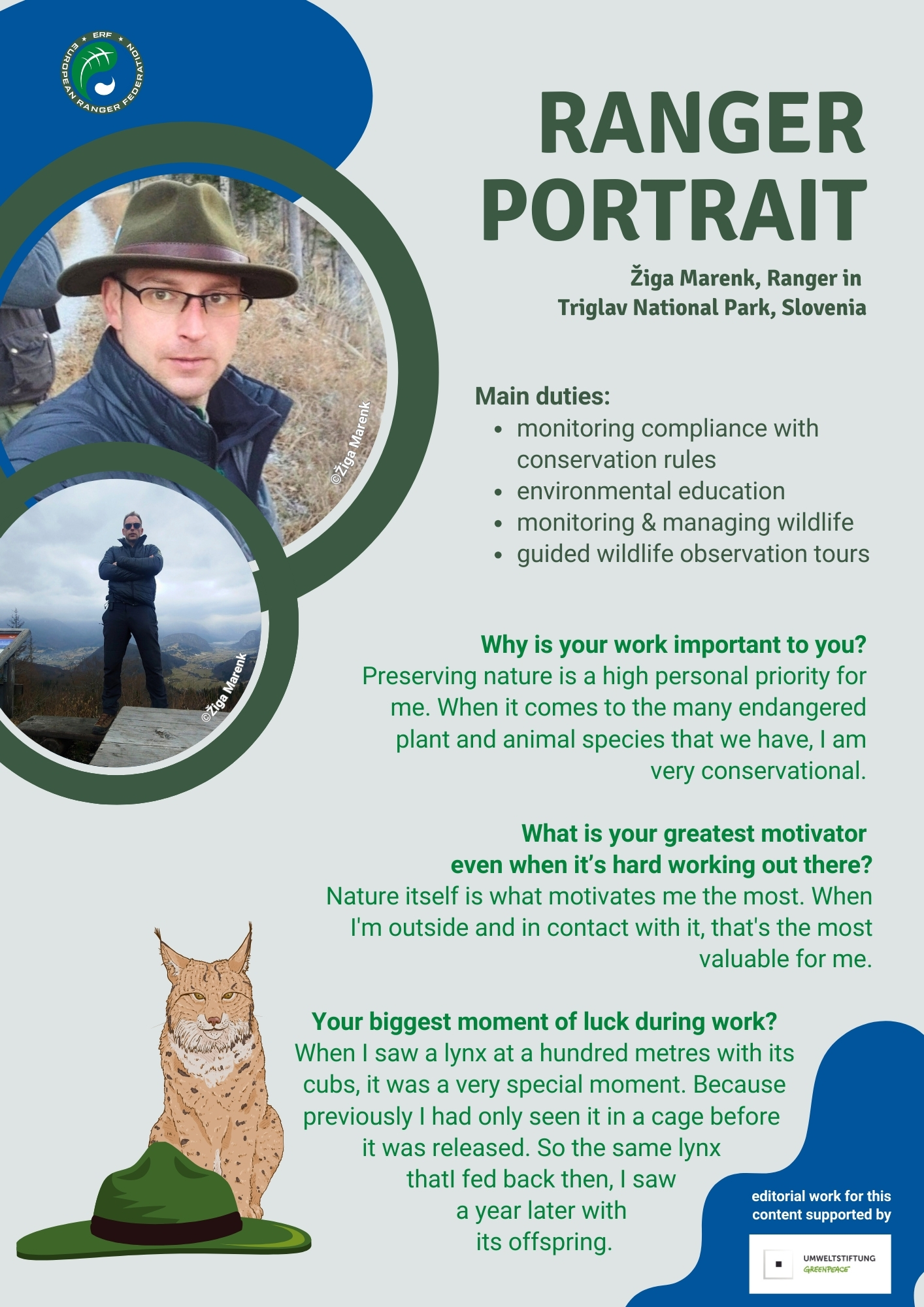 Mihály Tóth and Žiga Marenk know only too well how important it is to have the locals on their side. Mihály from Őrség National Park is the responsible ranger in the first rewilding project for bison in Hungary. He is helping to attract tourists through bison safaris and thus new sources of income in the local communities. Whereas Žiga works closely with locals around Triglav National Park, Slovenia, to inform them about permitted construction. In return, he receives not only trust, but also information about striking activities in his ranger area.
