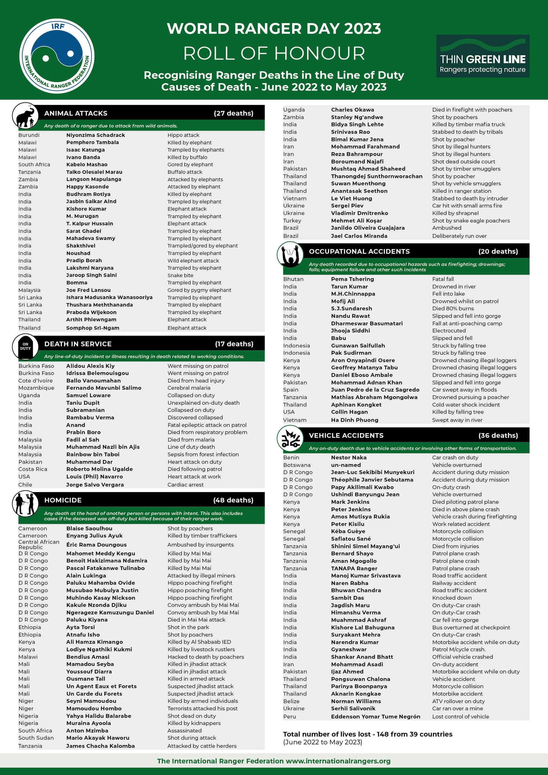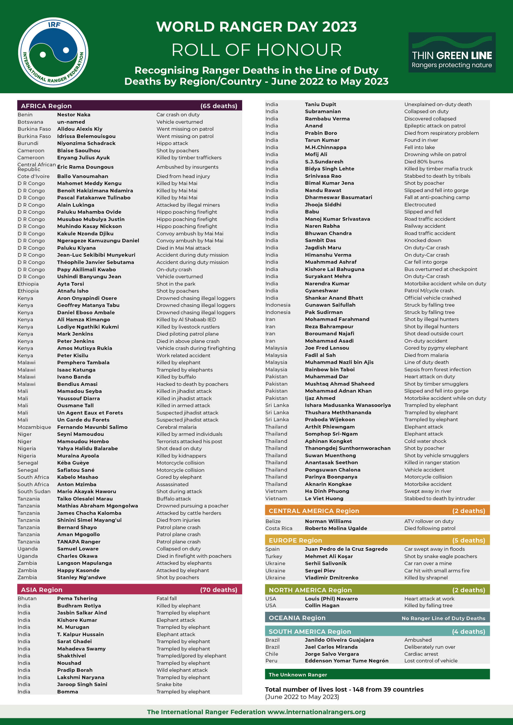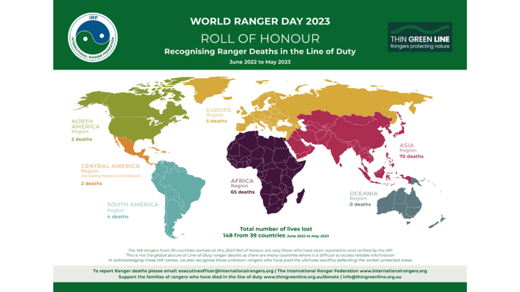 Next Monday, rangers and friends around the world will remember colleagues who have died in the line of duty. 148 of their colleagues from 39 countries have died between June 2022 and May 2023, most of them by homicide, according to the International Ranger Federation (IRF) – not to mention the many unreported cases. Every single life lost while protecting our natural treasures and cultural sites is one too many and must give us every reason to equip rangers so that they do not risk their lives by going to work.